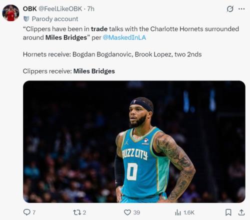 1月21日,埃文-斯迪瑞又报道,湖人与黄蜂已经就迈尔斯-布里奇斯进行过试探性的对话。实际上在小桥1月16日拿到25分8篮板4助攻帮助黄蜂击败湖人后,他的竞技状态就暴跌。